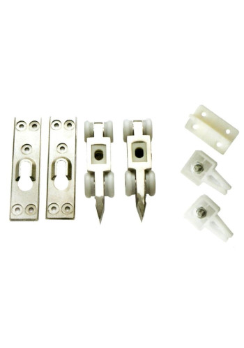 • Комплектация: Комплект роликов для раздвижных дверей состоит из монтажной пластины (2 шт), каретки с колесиками с подшипниками (2 шт), стопоров 2 шт и нижнего флажка 1 шт, регулировочного ключа и комплекта шурупов.